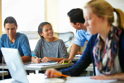 Fototapeta premium High School Students With Teacher In Class Using Laptops