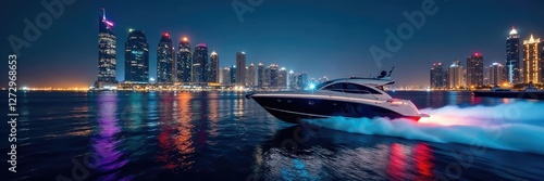 © Kingphet, Obraz premium High-speed boats speeding across Dubai Marina at night, nighttime, fast boat