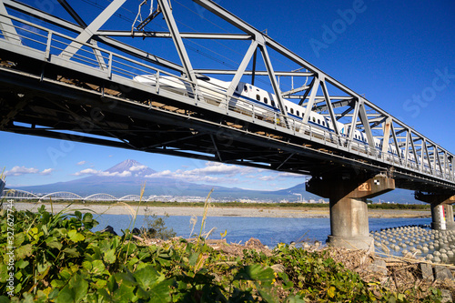 © Chaiyuth, Naklejka premium High Speed Bullet Train Shinkansen ran across Fuji river with Fuji Mountain Background in Winter Clear Sky Day, Fuji City, Shizuoka