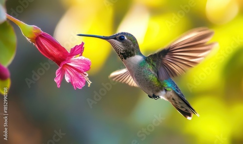 © SanyBRZ, Obraz premium High-speed close-up of a hummingbird hovering near a bright pink flower, delicate wings beating rapidly, sunlight illuminating iridescent feathers
