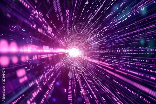 Naklejka premium High-speed data tunnel with glowing lines and binary code, symbolizing the fast-paced nature of technology in digital marketing. purple background