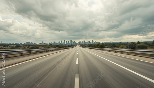 Fototapeta premium High-speed driving on a highway towards a distant city skyline under a dramatic cloudy sky