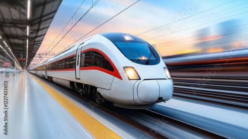 © Edhar, Naklejka premium High-speed eco-friendly trains glide on futuristic magnetic tracks in a vibrant urban environment at dusk
