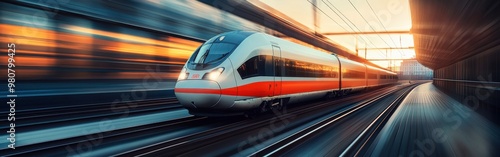 © gen_pick, Fototapeta premium High-speed electric train moving through urban landscape