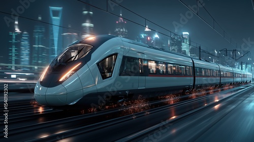 Naklejka premium High-speed modern train travelling through urban landscape at night