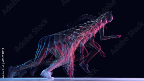 © Lustre Art Group , Fototapeta premium High-speed motion-trail of athlete pushing into sprint start in dark studio. Concept of starting mechanics, explosive-power training, movement analytics, and professional sports visuals.