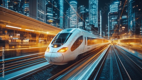 © mirifadapt, Fototapeta premium High-speed passenger train moving at railway station platform.