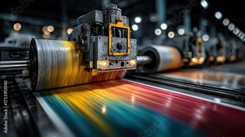 © Inayati, Fototapeta premium High-speed printing machine in operation, industrial printing process close-up shot