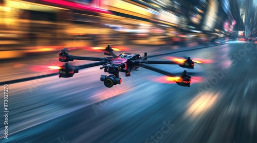 © Rakyandani, Obraz premium high speed racing drones in action, motion blurred city street
