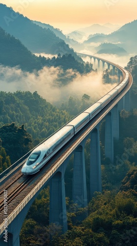 Obraz premium High-Speed Rail Journey Through Misty Mountains: A Scenic Train Ride in China