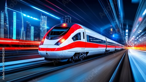 Fototapeta premium High-Speed Rail Through Cityscape at Night