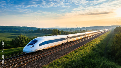 Naklejka premium High-Speed Rail Train at Sunset over Water