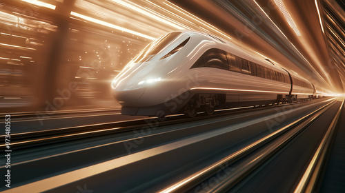Fototapeta premium high-speed railway train in full motion, with particle light effects accentuating the edge of the rail. The scene should use a high-definition photography style to capture the slee