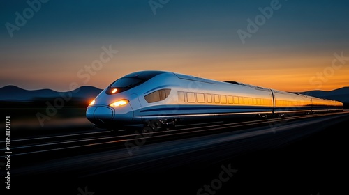 © FocusFusion, Obraz premium High-speed train advances smoothly towards station with mountains in the background during twilight hours