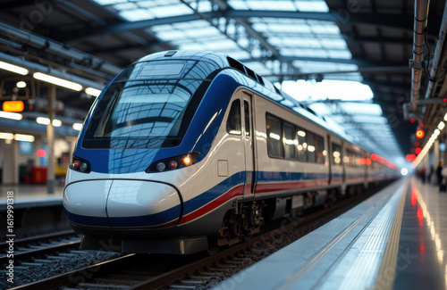 © starush, Fototapeta premium High-speed train arriving at modern station with glass roof and bright lighting