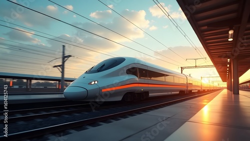 Naklejka premium High-Speed Train Arriving at Sunset Station