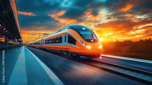 © nafsul, Fototapeta premium High-Speed Train at Sunset
