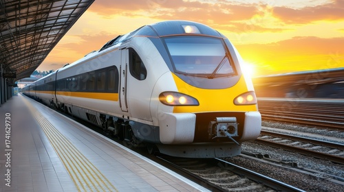 © JK_kyoto, Naklejka premium High-Speed Train concept. Modern High-Speed Train Departing from Station at Sunset with Vibrant Sky and Platform in Foreground