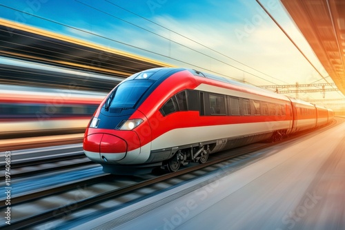 Fototapeta premium High-Speed Train in Motion Captured at Sunset with Blurred Background,...