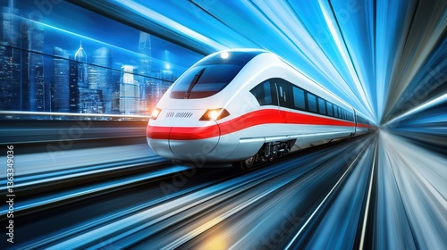 Fototapeta premium High-speed train in motion through urban landscape