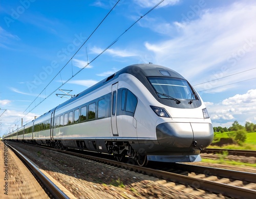 © Kopi, Fototapeta premium High-speed train moving on tracks under a bright sky