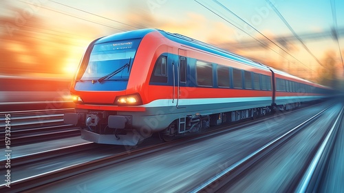 © izroil, Fototapeta premium High-speed train moving swiftly at sunset.