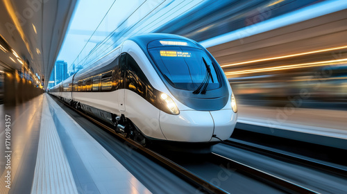 Fototapeta premium High speed train moving swiftly on tracks, showcasing modern design and...