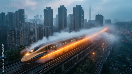 Naklejka premium High-speed train moving through foggy urban landscape. High-speed train moves through a foggy urban landscape, blending advanced technology with the misty city skyline for a dramatic effect.