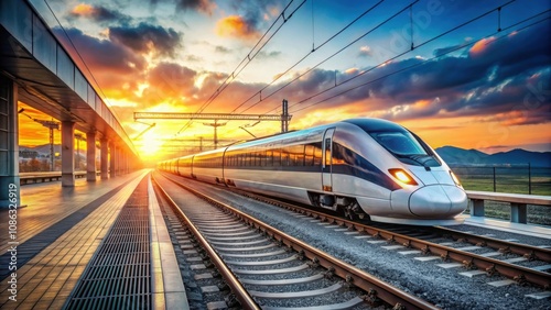 Fototapeta premium High speed train on railway platform at sunset , high speed, train, motion,...