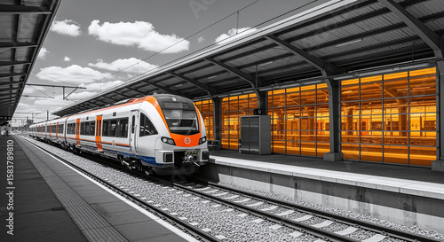 © igor.nazlo, Fototapeta premium High speed train on the railway station at sunset. Industrial landscape with modern intercity passenger train on the railway platform and blue cloudy sky. Railroad in Europe. Commercial transportation