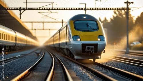 Naklejka premium High-speed train on tracks under a warm sunset representing modern...