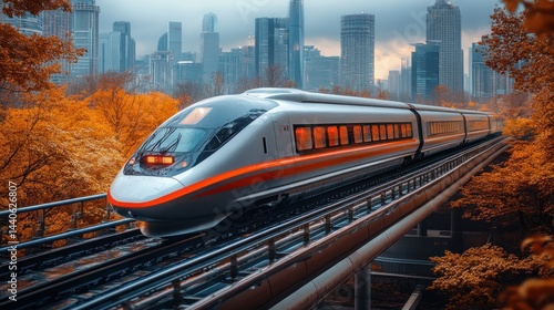 © Pawon.STD, Naklejka premium High-speed train on tracks with city skyline and autumn foliage in background.