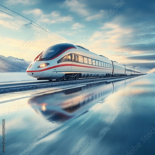 Naklejka premium high-speed train rushing across snow-covered Nordic plains, cold winter sunlight, icy reflections, realistic style