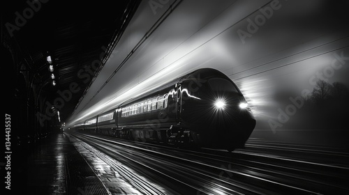 © sandi, Fototapeta premium High-speed train rushing through a misty station at night, showcasing motion blur