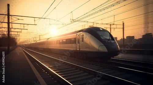 © Suleyman, Fototapeta premium High speed train silhouette in motion at sunset. Fast moving modern passenger train on railway platform Generative AI