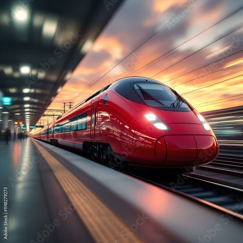Naklejka premium High-speed train, sleek red design, train station platform