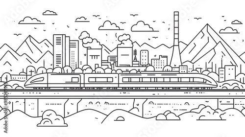 © Anusa, Obraz premium High Speed Train Speeding Through a Modernistic Urban Landscape with Power Plant