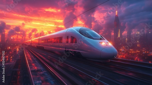 © banyu bening, Fototapeta premium High-speed train speeding through futuristic city at sunset.