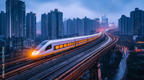 Naklejka premium High Speed Train Through Cityscape at Dusk