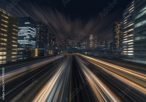 © RABBI, Fototapeta premium High-Speed Train Through Cityscape at Night