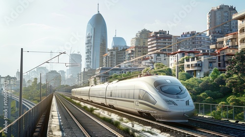 Naklejka premium High-Speed Train Traveling Through a Modern City