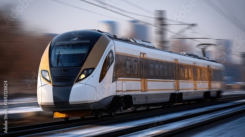 Naklejka premium High-speed train traveling through a snowy landscape in an urban setting during early morning hours