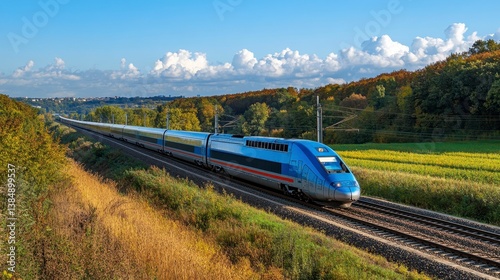 Fototapeta premium High-speed train traveling through vibrant countryside landscape