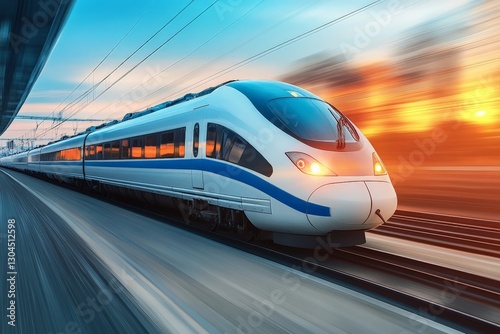 Naklejka premium High-speed train travels swiftly through urban landscape during sunset with...