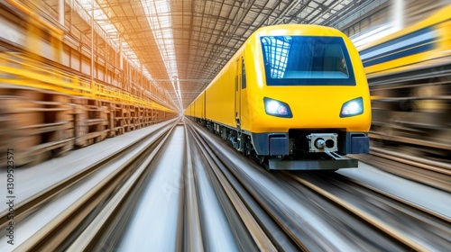 © A4719, Naklejka premium High speed yellow train speeding through a modern train depot, motion blur effect, bright lighting.