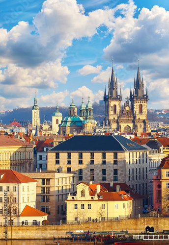 © Yasonya, Naklejka premium High spires towers of Tyn church in Prague city (Church Our Lady before cathedral) urban landscape panorama with red roofs houses old town and blue sky clouds