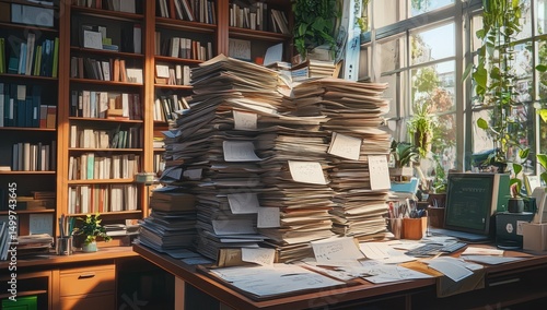 © Adri, Obraz premium High stack of papers, bookshelves, & desk