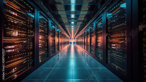 © piai, Fototapeta premium High-tech and futuristic interior of a massive data center. Generative AI