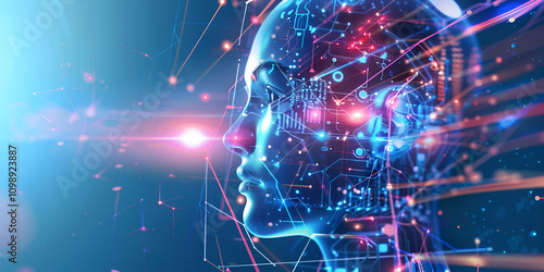 Obraz premium High-Tech Artificial Intelligence Head with Digital Lines, Advanced Cyber AI...