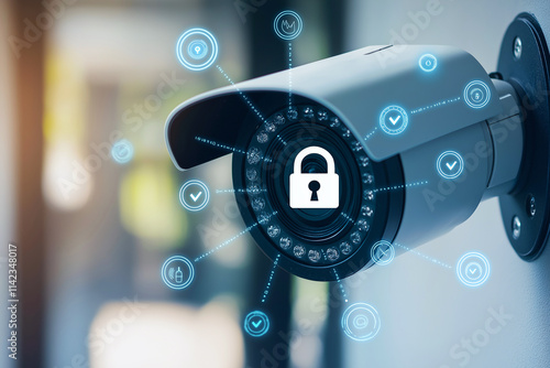 Obraz premium High tech CCTV camera mounted on wall, featuring lock symbol and digital security icons, representing surveillance and safety